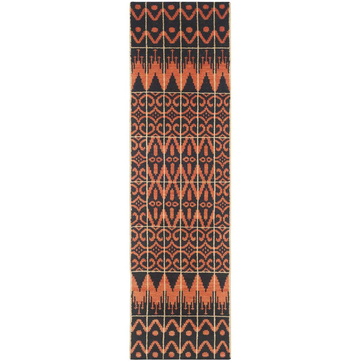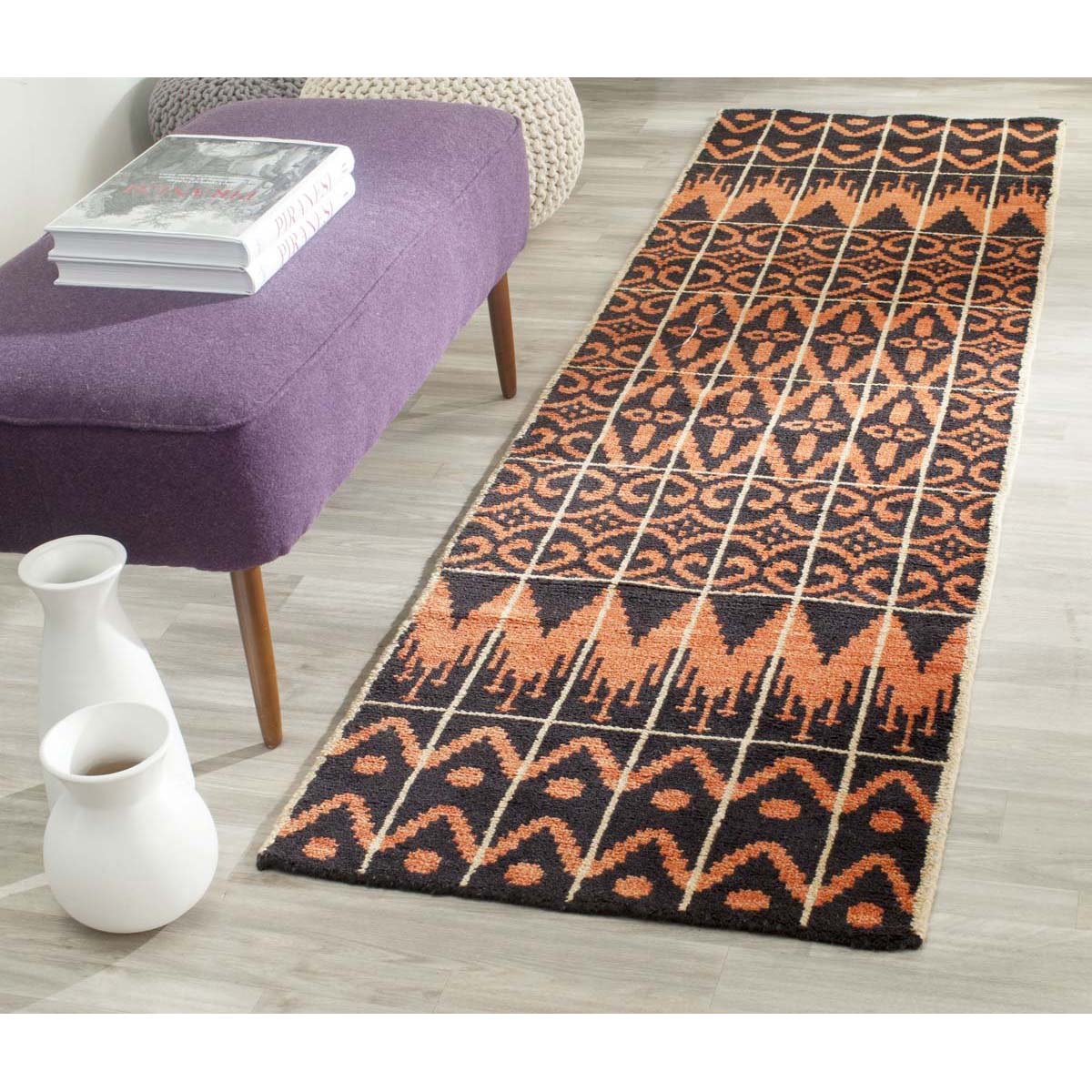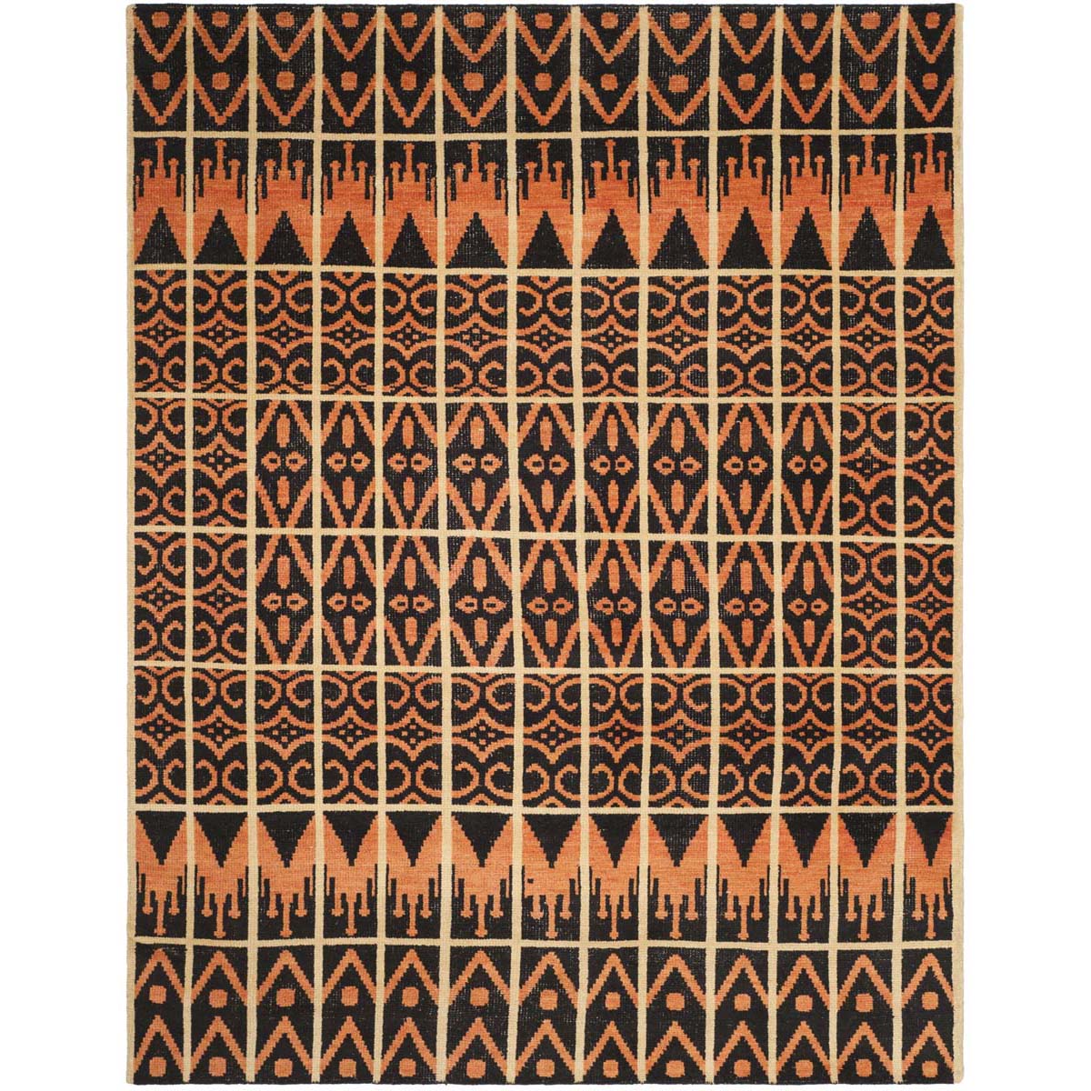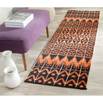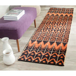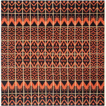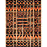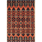 The bold orange and black colors create a striking contrast that will capture the eye and enliven your space. Inspired by traditional motifs, the rug's pattern showcases an intricate array of geometric shapes and stylized designs that speak of its rich heritage and skilled artistry.