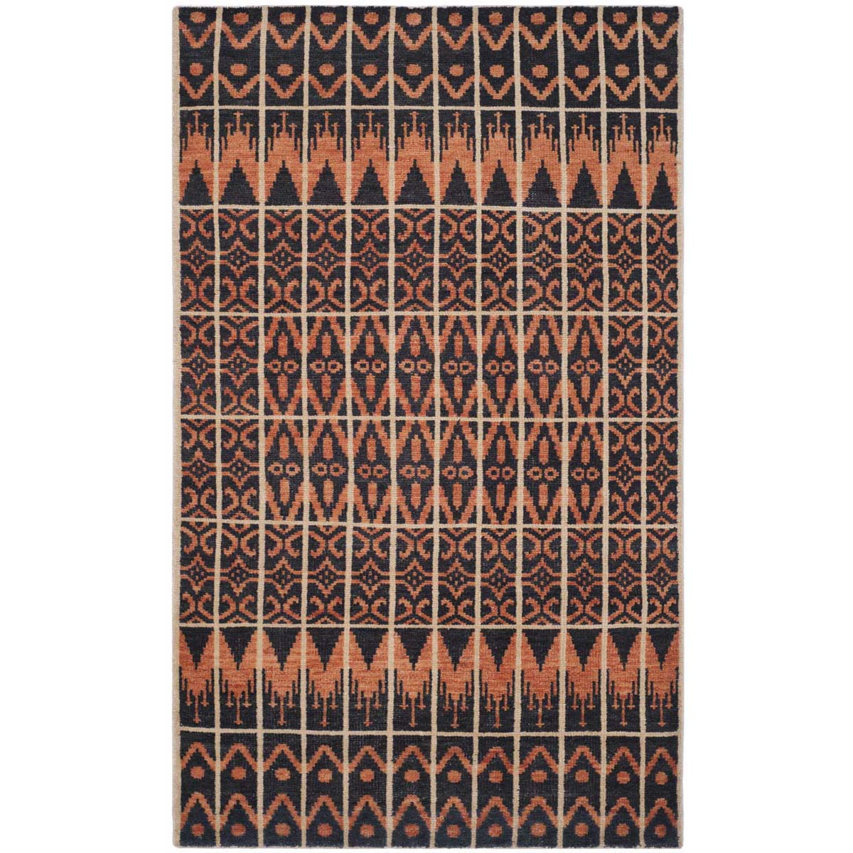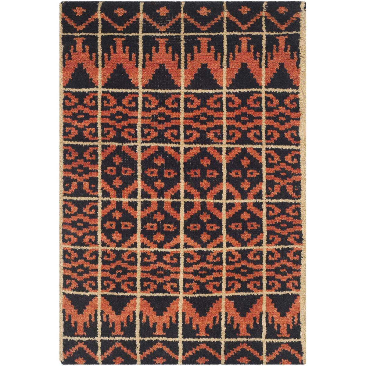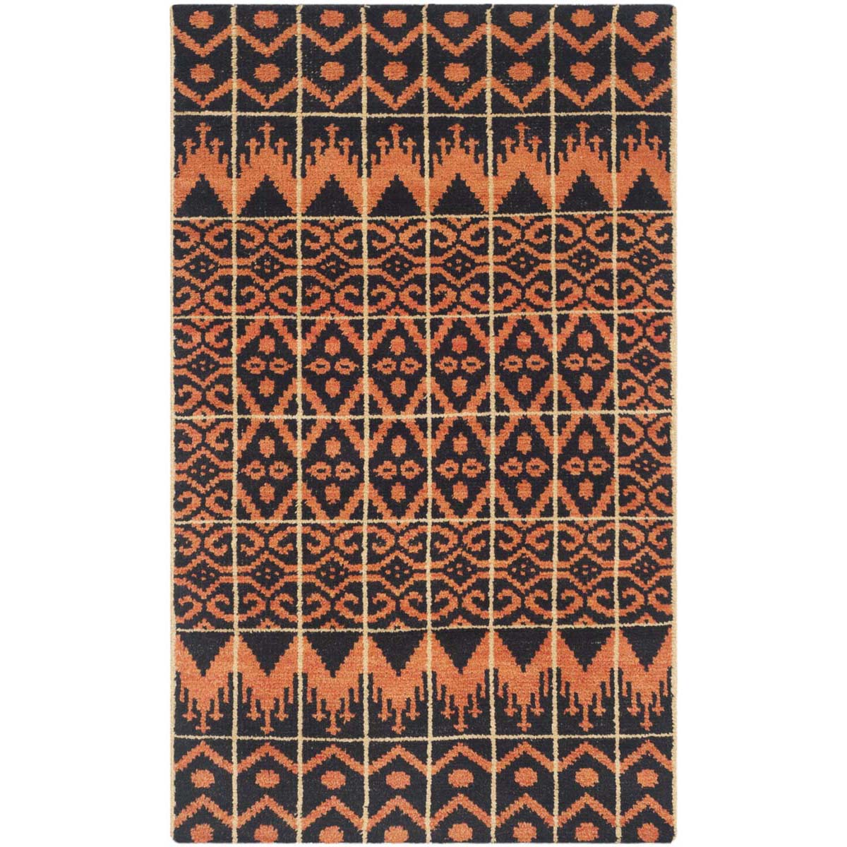 The bold orange and black colors create a striking contrast that will capture the eye and enliven your space. Inspired by traditional motifs, the rug's pattern showcases an intricate array of geometric shapes and stylized designs that speak of its rich heritage and skilled artistry.