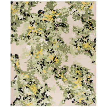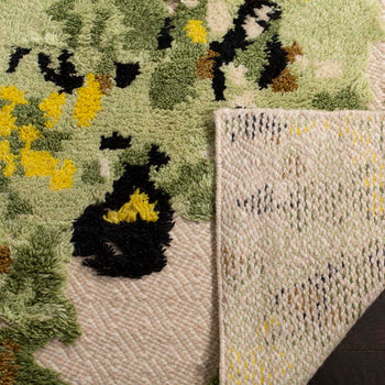 Elevate your living space with the timeless charm of our hand-knotted Area Rug in a generous 9' x 12' size. Featuring a harmonious blend of green and beige hues, this large rectangular rug showcases an organic pattern that draws inspiration from nature, with intricate shapes and detailing that suggests lush foliage and floral elements in various stages of bloom and growth.