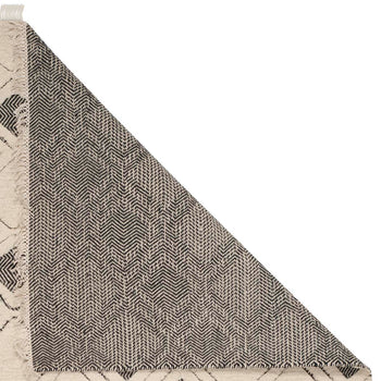 Inspired by modern geometric aesthetics, the ivory and black color palette is both bold and minimalist, making it an adaptable piece for a variety of decor schemes. The striking pattern showcased in this rug is composed of diamond motifs interspersed with intricate, abstract lines, offering a sophisticated look that captures the eye.