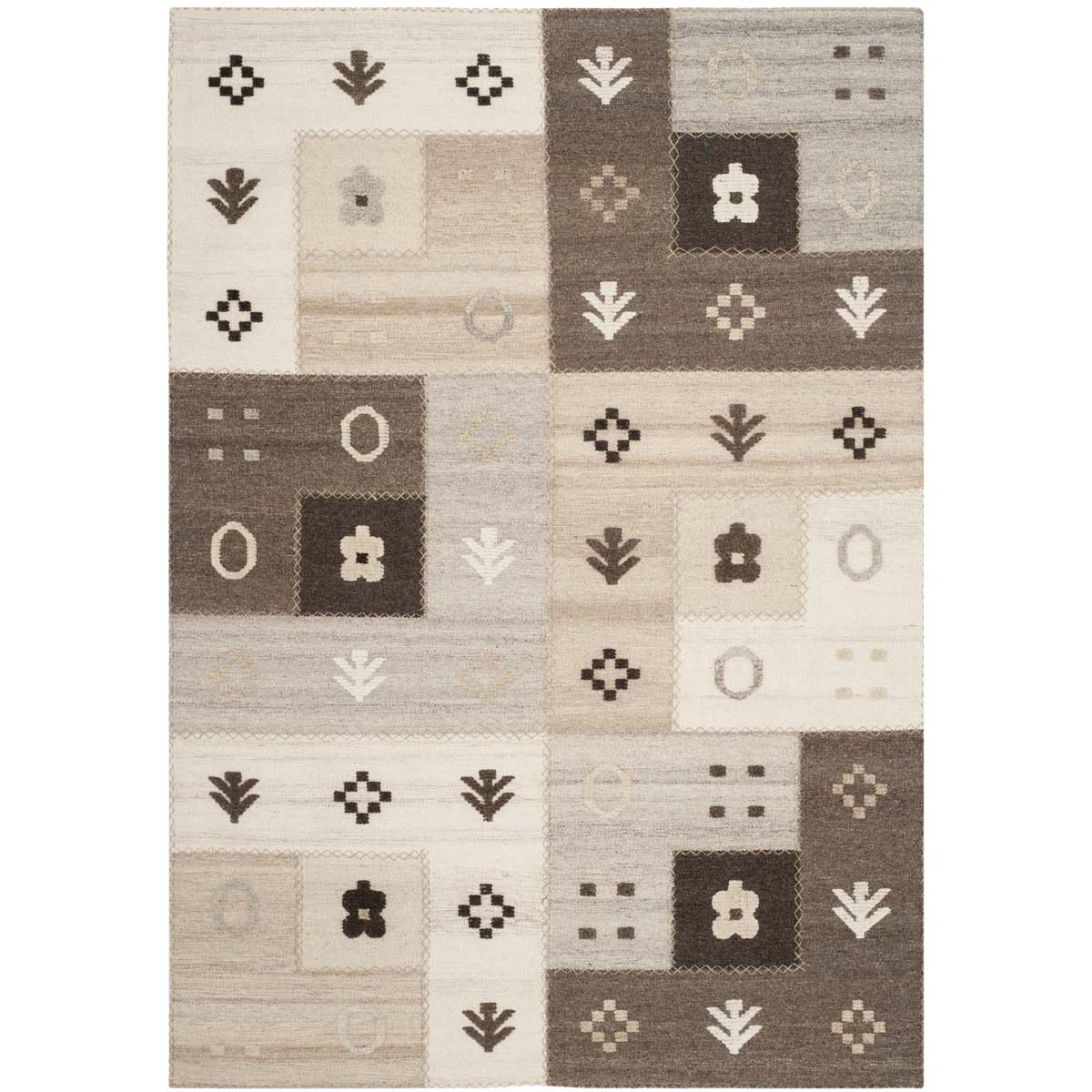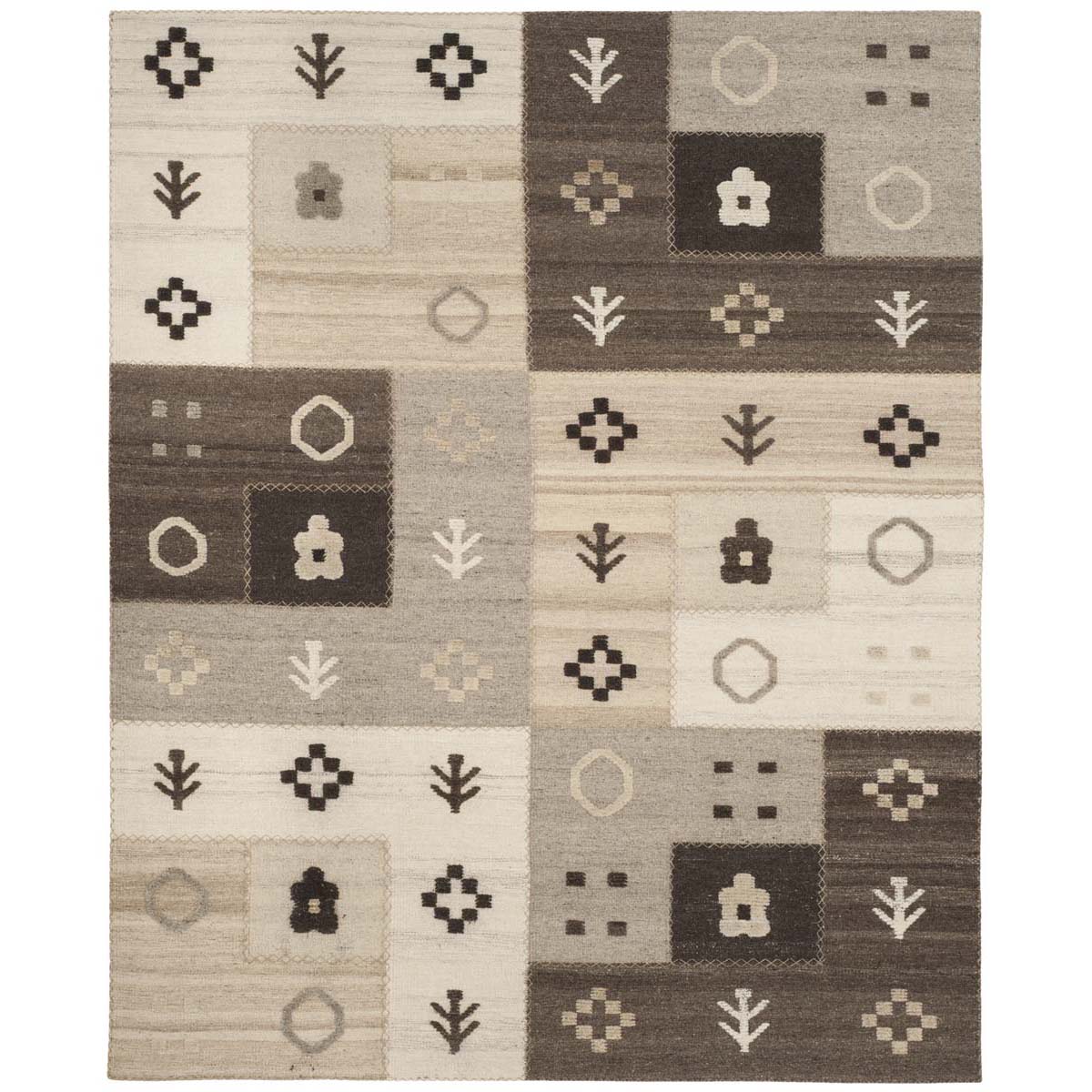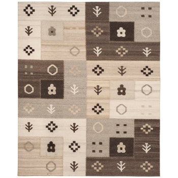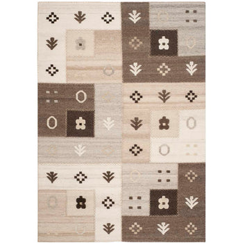 Drawing inspiration from classic design elements, the rug showcases a harmonious blend of earthy tones, creating a serene and inviting atmosphere. The pattern is an eclectic mix of geometric shapes and stylized botanical motifs, intricately woven to form a tapestry of visual interest. The interplay of diamonds, florals, and symmetrical accents offers a balance of organic charm and structured beauty, making this rug an ideal focal point for both contemporary and traditional interiors.