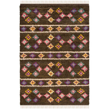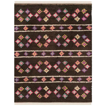 The delightful rug pattern displayed in the image showcases a symphony of multi-colored motifs that dance across a deep, earthy backdrop, distinguished by horizontal stripes that frame and accentuate each design element. The spirited composition of pink, purple, turquoise, and yellow adds a burst of color and personality, while the hand-knotted technique lends an authenticity and uniqueness that cannot be replicated by machine-made counterparts.