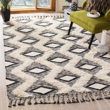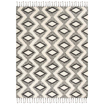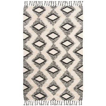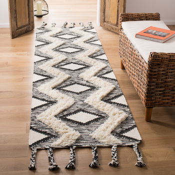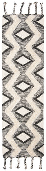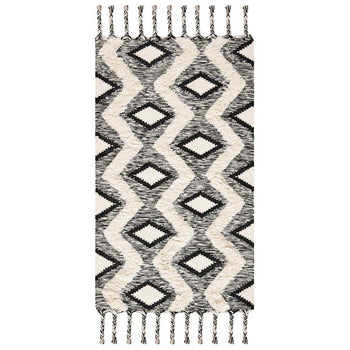 The eye-catching design features a bold black and ivory color palette that brings striking contrast to any hallway or narrow space. The rug's pattern, as depicted in the image, showcases an intricate geometric motif that is both modern and timeless. The tasseled edges add an additional layer of texture and visual appeal, making this runner a standout addition to your home decor.