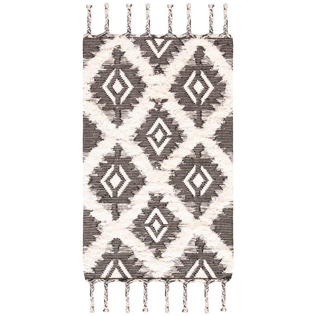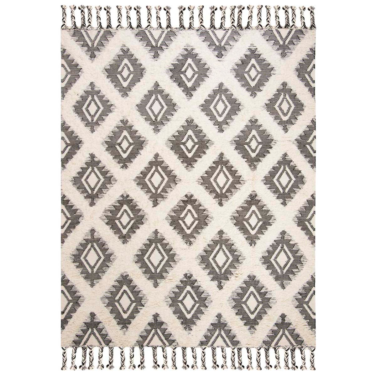 With its geometric diamond and angular motif, this area rug brings an element of tribal-inspired design to your floors. The pattern, noted for its crisp lines and dynamic tribal shapes, offers a sense of rhythm and dimension to your living space. The tassel fringe detailing adds a playful finish to the border, enhancing the handcrafted appeal.