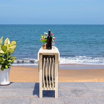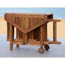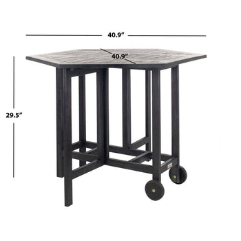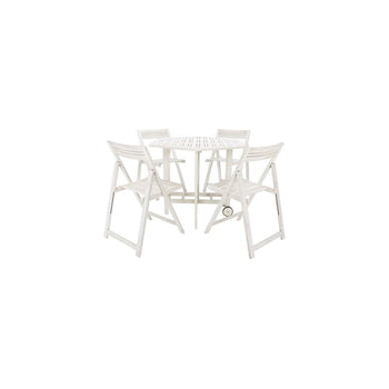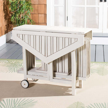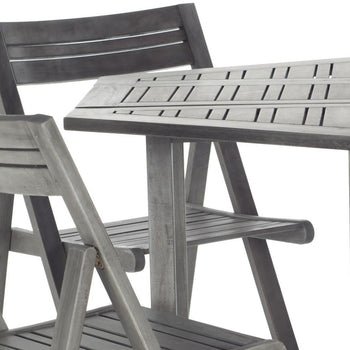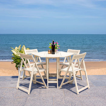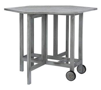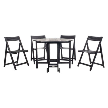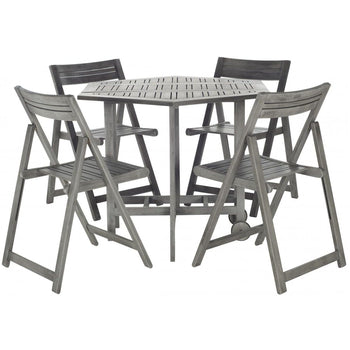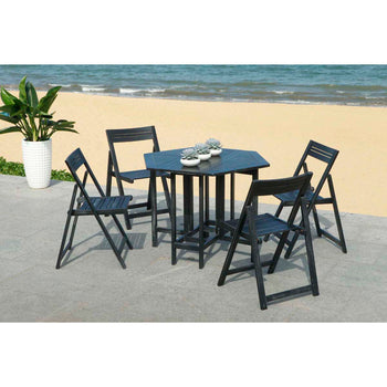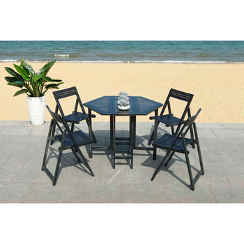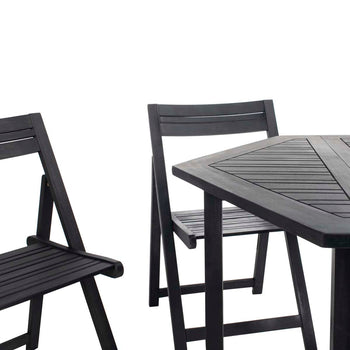 Stack the odds for carefree outdoor living in your favor with the ingenious Kerman dining table and chair set. Crafted of eco friendly acacia wood, 4 director style chairs fold and tuck under a foldable hexagonal table for easy storage.