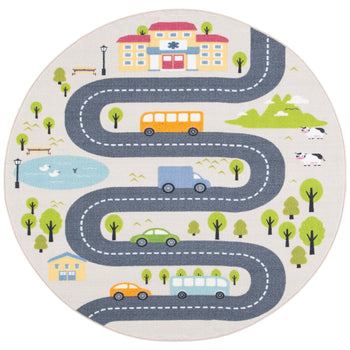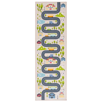 Transform your child's room into a playful roadway with our delightful area rug! In a charming square shape, measuring 3 feet 3 inches on each side, this rug features a whimsical road and town pattern bursting with vivid colors?beige acts as the neutral backdrop, while pops of green, along with other cheerful hues, adorn the landscape.