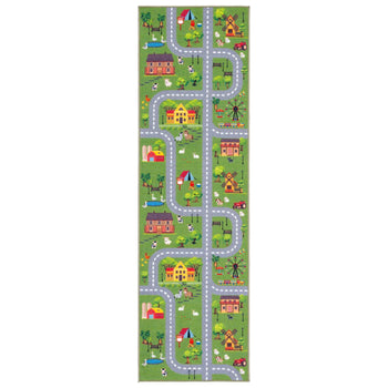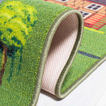 The dark green and light grey colorway sets a soothing backdrop for the whimsical pattern that invites children to explore a miniature world right at their feet. With winding roads, colorful buildings, and friendly animals, this rug doubles as an imaginative play mat where stories can unfold and adventures can take place.