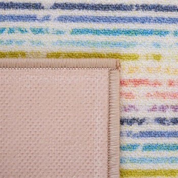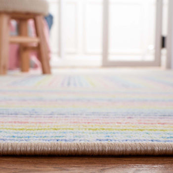 Brighten up your child's playroom or bedroom with this cheerful 5' x 5' round Ivory/Blue area rug! Crafted in Turkey using advanced power-loomed techniques, this rug boasts a vibrant pattern featuring playful stripes in a delightful mix of colors, blending seamlessly into any kid-centric space.