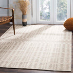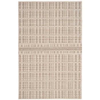 Elevate your living space with the timeless elegance of our 5' X 8' hand-woven area rug, crafted with the utmost care and precision in India. This exquisite piece combines a tasteful ivory and light grey palette with a distinctive pattern that features a series of harmonious lines and geometric motifs, creating a subtle yet striking aesthetic.