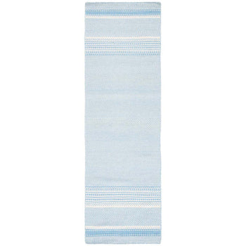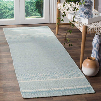 Introducing our charming hand-woven accent rug, a perfect combination of traditional craftsmanship and contemporary style. Embrace the serene elegance of light blue and ivory colors, seamlessly blending into your home decor. This 2' X 3' artful creation is proudly made in India, featuring a delicate flat weave technique that reveals the extraordinary skills of our artisans.