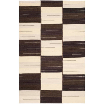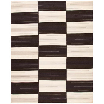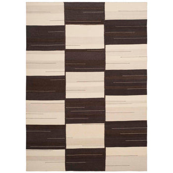 Our exquisite rug features a harmonious blend of beige and brown hues, creating a warm and inviting atmosphere in any room. The sophisticated pattern displayed in the image showcases a contemporary geometric design with clean lines and varying stripe widths that add depth and texture to the aesthetic.