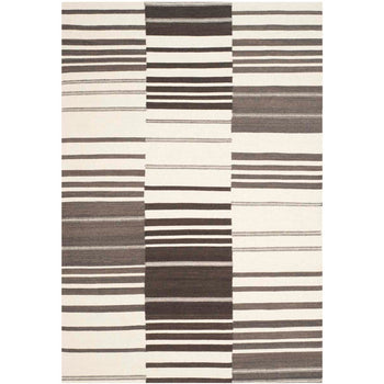 The rug features a distinguished dark brown and ivory color palette, seamlessly blended to create a series of striking horizontal stripes, varying in width to add visual interest and texture to the piece. The flat weave technique, practiced by skilled artisans, gives the rug a low profile with a height of just 1/4", making it a perfect addition to high-traffic areas and under doorways.