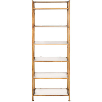 Both urban and contemporary, the Kimmy Etagere is a hard working yet elegant storage solution. Crafted of white wood shelves and gold finished iron frame, this well proportioned etagere functions as a bookcase or display piece.