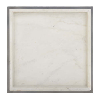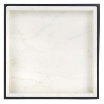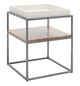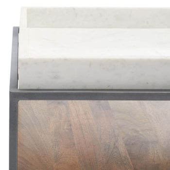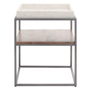 Natural elements enrich the penthouse chic style of the Kya Stone 2 Tier Table. Designed with artful asymmetry, the raised sides of Kya's removable marble tray top lend a hint of depth and dimension especially beneficial in smaller spaces. A walnut toned wood shelf beautifully balances with an open black metal frame.