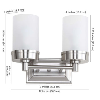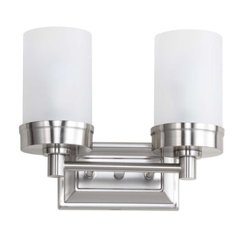 Perfect for revitalizing any bathroom, this modern two light bathroom sconce is an investment in style. Designed with two deluxe white glass shades, it radiates light with an upward glow. Its metal construction and rich nickel finish make it a classic.