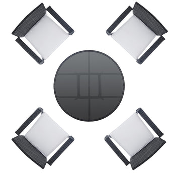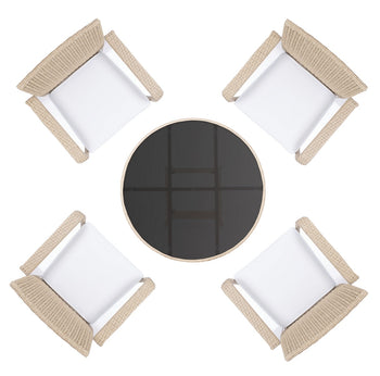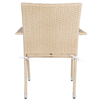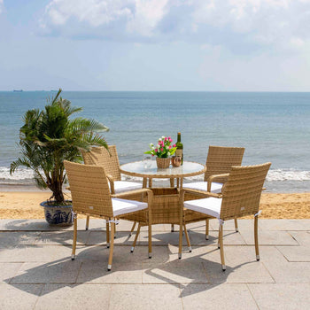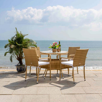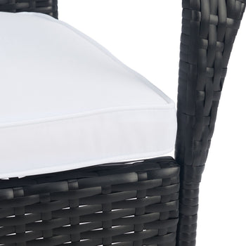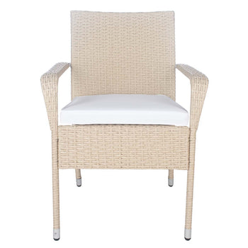 A modern take on French al fresco dining, al fresco dining, this Laina Bistro Set emanates class and charisma on any porch or patio. Beige wicker details update Laina's classically styled table and chairs, and soft white cushions make for comfortable, res