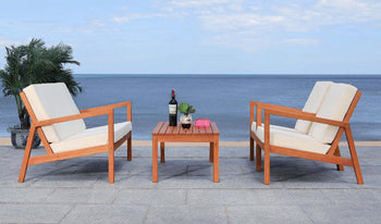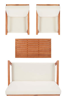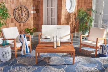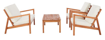 Fun and functional, this 4 piece outdoor living set was designed for versatility and value. Crafted with natural eucalyptus wood, its coffee table, inviting settee and two deluxe chairs feature clean lines and plush cushions to create a relaxing oasis.