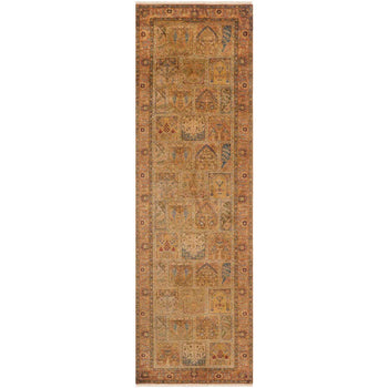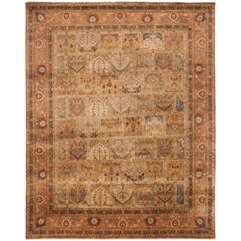The rug features a stunning array of patterns, harmoniously blending geometric, botanical, and paisley motifs into a cohesive design that captures the eye. Every square inch tells a story with its unique motif, making it a focal point in your living room, dining area, or bedroom. The intricate border frames the rug, echoing its internal pattern and completing the overall aesthetic with a well-defined edge.