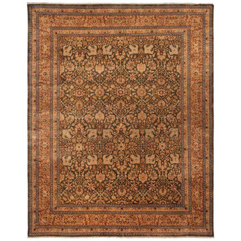 Adorned with an opulent design, the rug boasts intricate patterns that speak to an age-old tradition of rug making. Its rich moss base interwoven with touches of gold illuminates your room, bringing a warmth and sophistication that complements your home's decor. The elegant floral and geometric motifs are harmoniously balanced, imbuing your space with a sense of tranquility and grandeur.