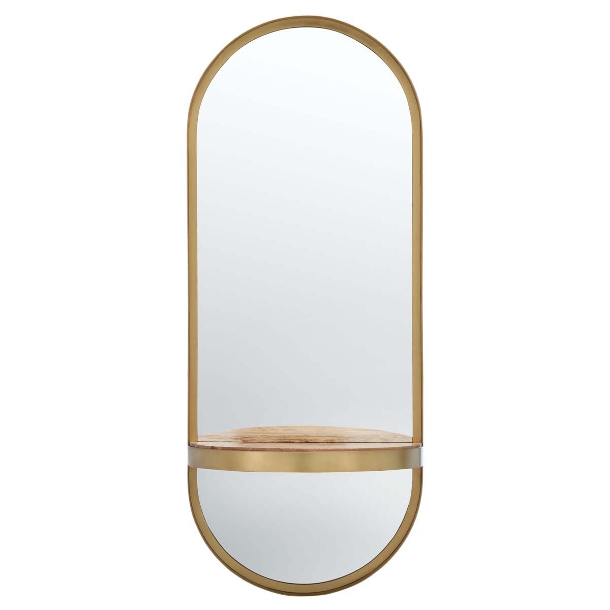 The definition of contemporary elegance, this lovely Laycie Mirror punctuates any room with astounding finesse. Laycie's brushed brass frame shimmers glamorously, while its natural wood shelf adds a chic modern edge.