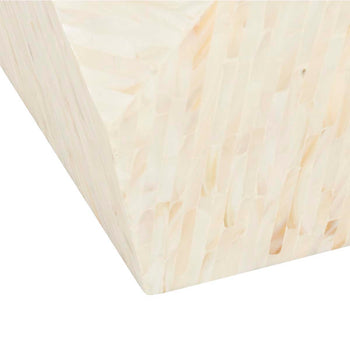 Bold and beautiful, this contemporary mosaic geometric side table instantly transforms any living room. Designed with lacquered faux mother of pearl, its soft beige tones illuminate its dynamic sculptural form to create a chic, functional focal point.