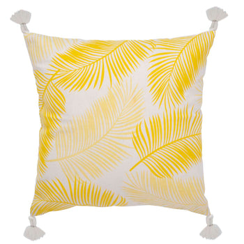 A fun blend of boho chic and coastal cool, this Lemi Pillow brightens any space with a touch of tropical whimsy. Sketched palm fronds in brilliant lemon yellow flow across a soft ivory cotton blend, ensuring Lemi's comfort soft feel and lasting design clarity. Playful tassels add to its airy appeal.