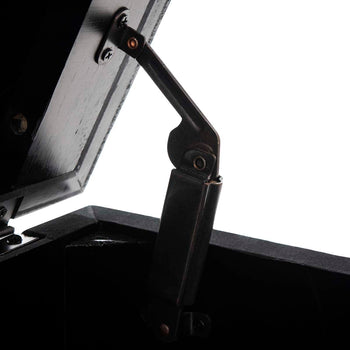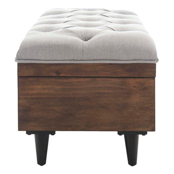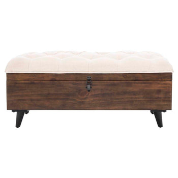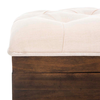 This modern tufted cocktail ottoman adds stylish seating and generous storage to any living room. Crafted with a classic dark oak finish, its generous light beige linen upholstery features tufted details. Designers often use it as an impromptu tabletop.