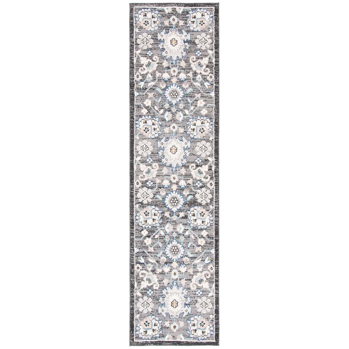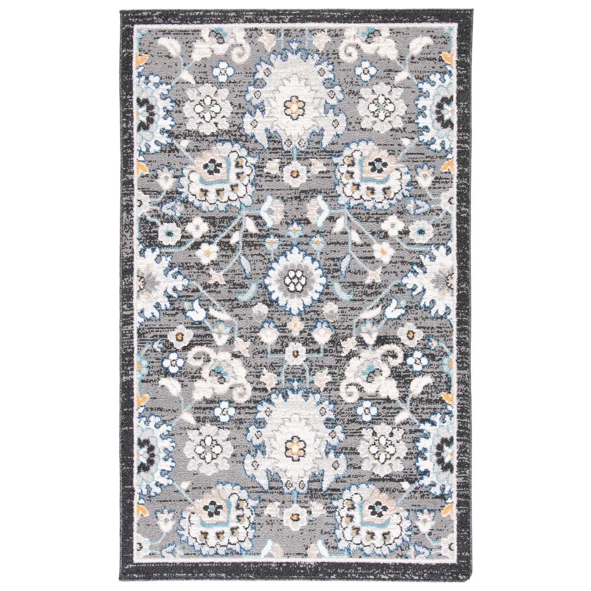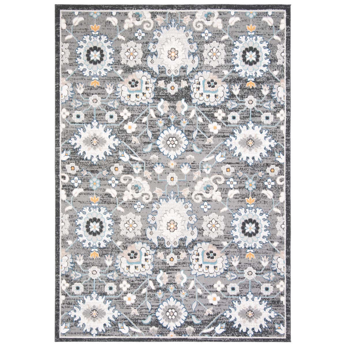 Drawing inspiration from both country and floral aesthetics, this rug showcases a harmonious blend of classic style with a modern twist. The intricate floral pattern in shades of grey and ivory brings a serene yet sophisticated ambiance to any room. Delicate blue and subtle orange accents add just the right amount of color to enhance its overall appeal.