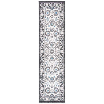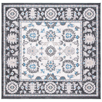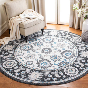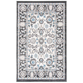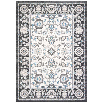 The traditional style of this rug is accentuated by a rich dark grey and ivory color scheme, lending a sense of grandeur and luxury to your space. It features an intricate pattern that exudes classical charm, with decorative motifs that draw the eye and evoke the grandeur of ancient tapestries.