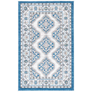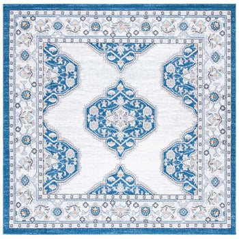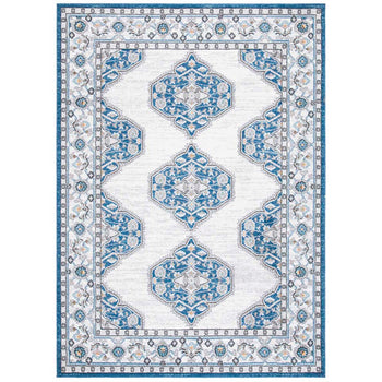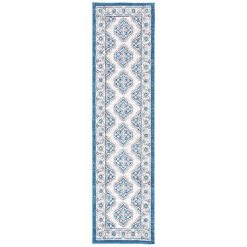 The inviting dark blue and ivory color palette creates a harmonious balance between contemporary and traditional styles, making it a versatile addition to any corridor, hallway, or living space. The symmetrical pattern, bordered by a detailed frame, draws inspiration from heritage designs, offering a sense of sophistication and grandeur.