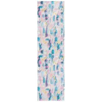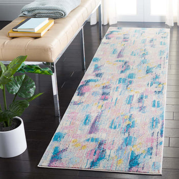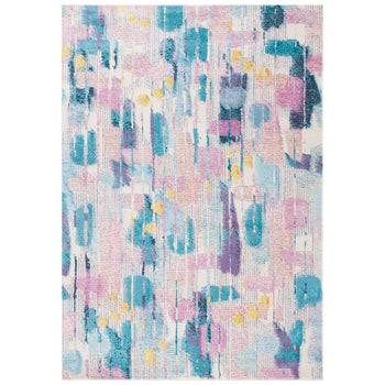 Splashed with a vibrant palette of pink and turquoise, the rug's bold and abstract pattern converges into an eye-catching statement piece. Each stroke and splash on the rug's surface brings a lively burst of color, giving it both an energetic and serene ambiance that complements a variety of decor settings.