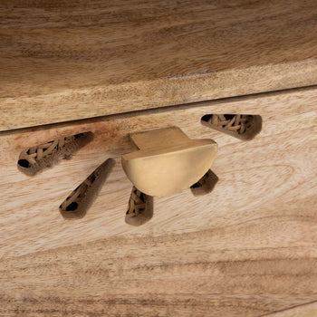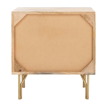 Inspired by Scandinavian style, the bold sculpted floral design on this 1 shelf 1 drawer nightstand adds modern romance to the bedroom. Crafted with a natural cane finish on mango wood and brass finished iron legs, it's a designer must have.