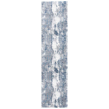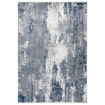 Crafted in the rich tradition of Turkish rug making, the rug features a sophisticated grey and blue color palette that harmoniously intertwines to create an abstract pattern reminiscent of painterly strokes and organic forms. The softness and resilience of the rug are attributed to its premium construction of 75% polypropylene and 25% polyester, materials known for their stain resistance and easy maintenance.