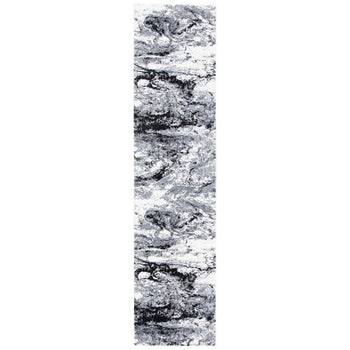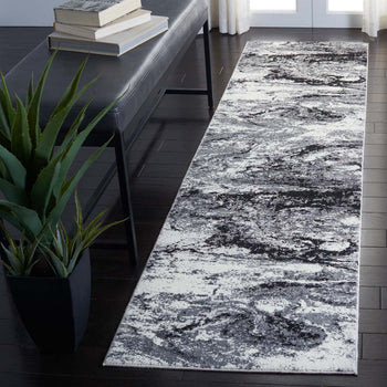 The contemporary style of the rug is brought to life with a beautiful palette of grey and blue hues, creating a serene and sophisticated atmosphere in any room. The design, beautifully depicted in the image, showcases a dynamic pattern that plays with abstraction and fluidity, reminiscent of natural elements like waves or marble textures.