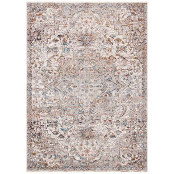 The harmonious beige palette, accented with a complex array of hues, provides a versatile backdrop that complements a variety of decor settings. Made with a plush 3/8 inch pile height, the rug ensures comfort underfoot while maintaining an easy-to-clean surface.