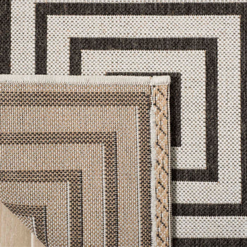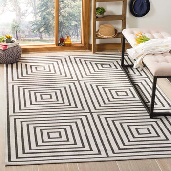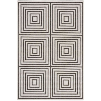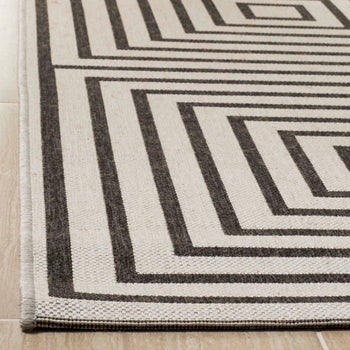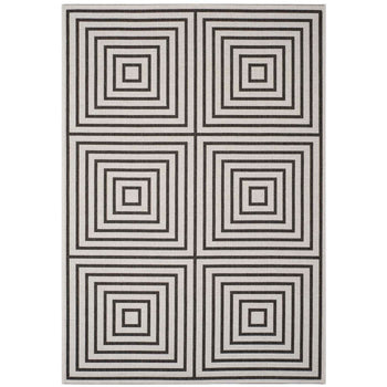 Expertly constructed using PowerLoomed techniques, this rug shines in its durability and intricate design, featuring a mesmerizing pattern of concentric squares that play with visual perception and bring a modern geometric aesthetic to your indoor or outdoor setting.