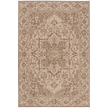 This rug does not compromise on versatility. Its construction materials and design make it perfectly suited to grace your interiors or uplift your outdoor spaces. Whether placed in your living room, under a dining table, in a covered patio, or by