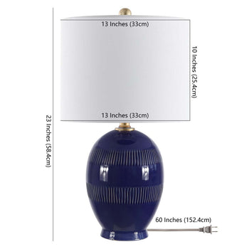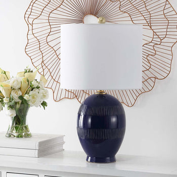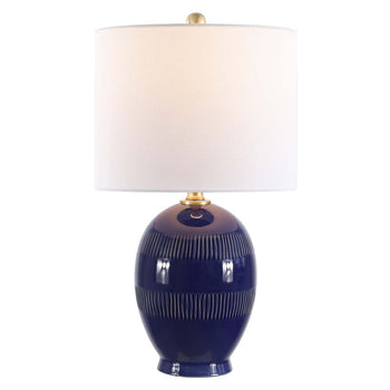 Give your Decor an aura of palatial artistry with this Liney Table Lamp. Featuring a striking juxtaposition of royal blue crackle ceramic and regal gold hardware, Liney's bands of linear detail adds captivating depth to its stellar design.