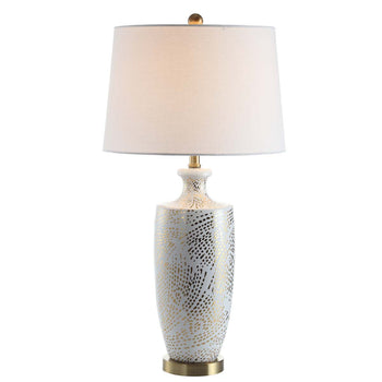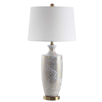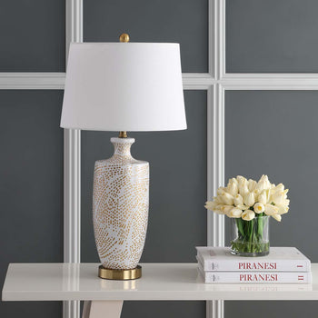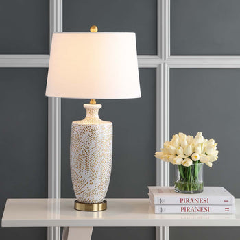 Designed to illuminate its radiant finish, this Linnea Table Lamp upgrades any living room. Its finely crafted ceramic body features a stunning white and gold finish and chic brass gold hardware.