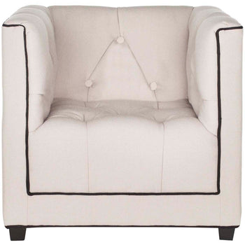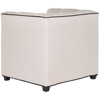 The Little Decorator club chair exudes the timeless flair of button tufted tuxedo styling. Pure linen upholstery in taupe with contrasting black piping, plush fill and birch wood legs recreate the character and style of armchairs in grownup living rooms.