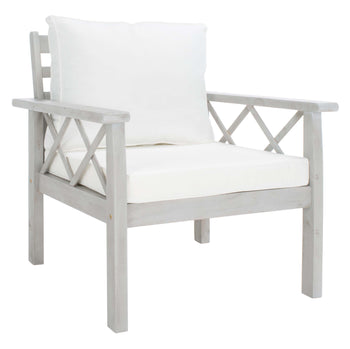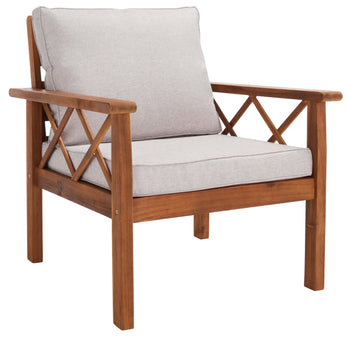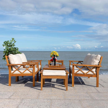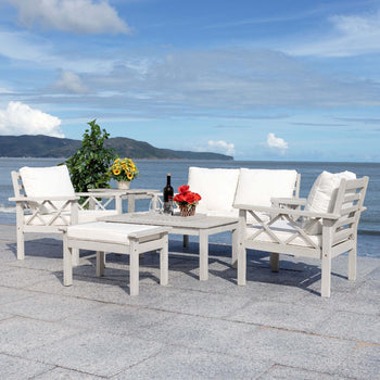 Traditional garden party furniture is given a contemporary-chic upgrade in this Loanna Outdoor Living Set. Including two armchairs, one loveseat, and one ottoman topped in plush beige upholstery as well as one accent table and one coffee table, designers are obsessed with the crossed X accents on Loanna's finished wood frames.