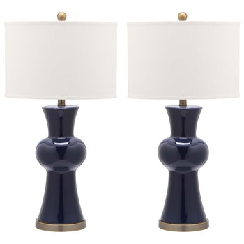 Perk up any room in the house with the young but sophisticated Lola column lamp. With navy blue ceramic hourglass base cinched in the center and contrasting bronze base and fittings, this colorful set of two lamps is contrasted with crisp white shades.