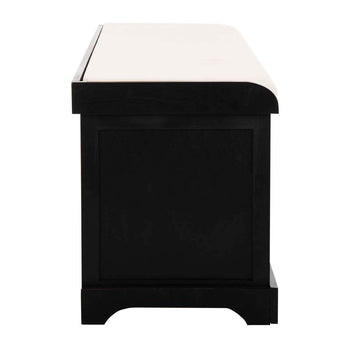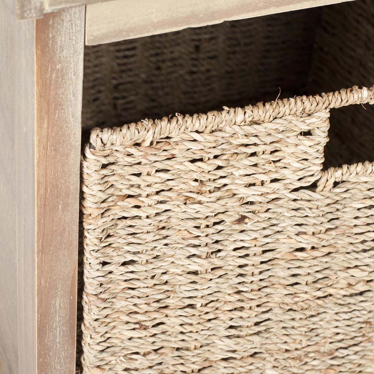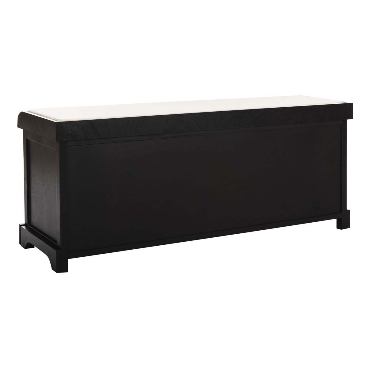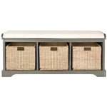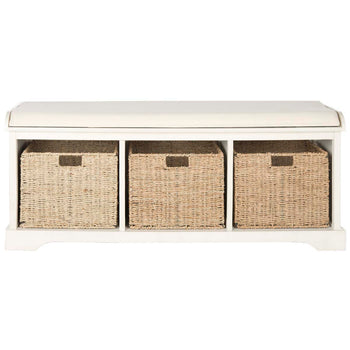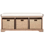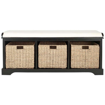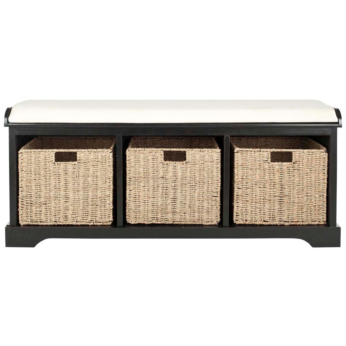 The Lonan Storage Bench is the perfect perch for removing boots in an entryway or garden shoes in the mud room. Crafted of pine in a distressed black finish, Lonan's three removable woven baskets provide no fuss storage, and a white cotton cushion completes the look with comfort and farmhouse charm.