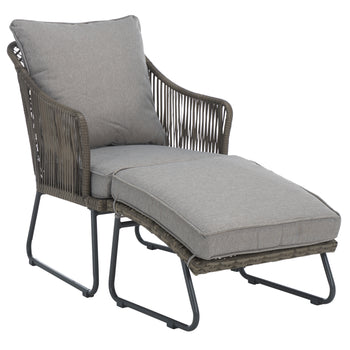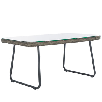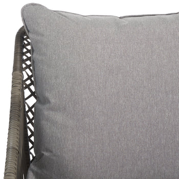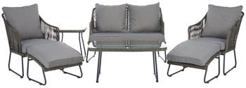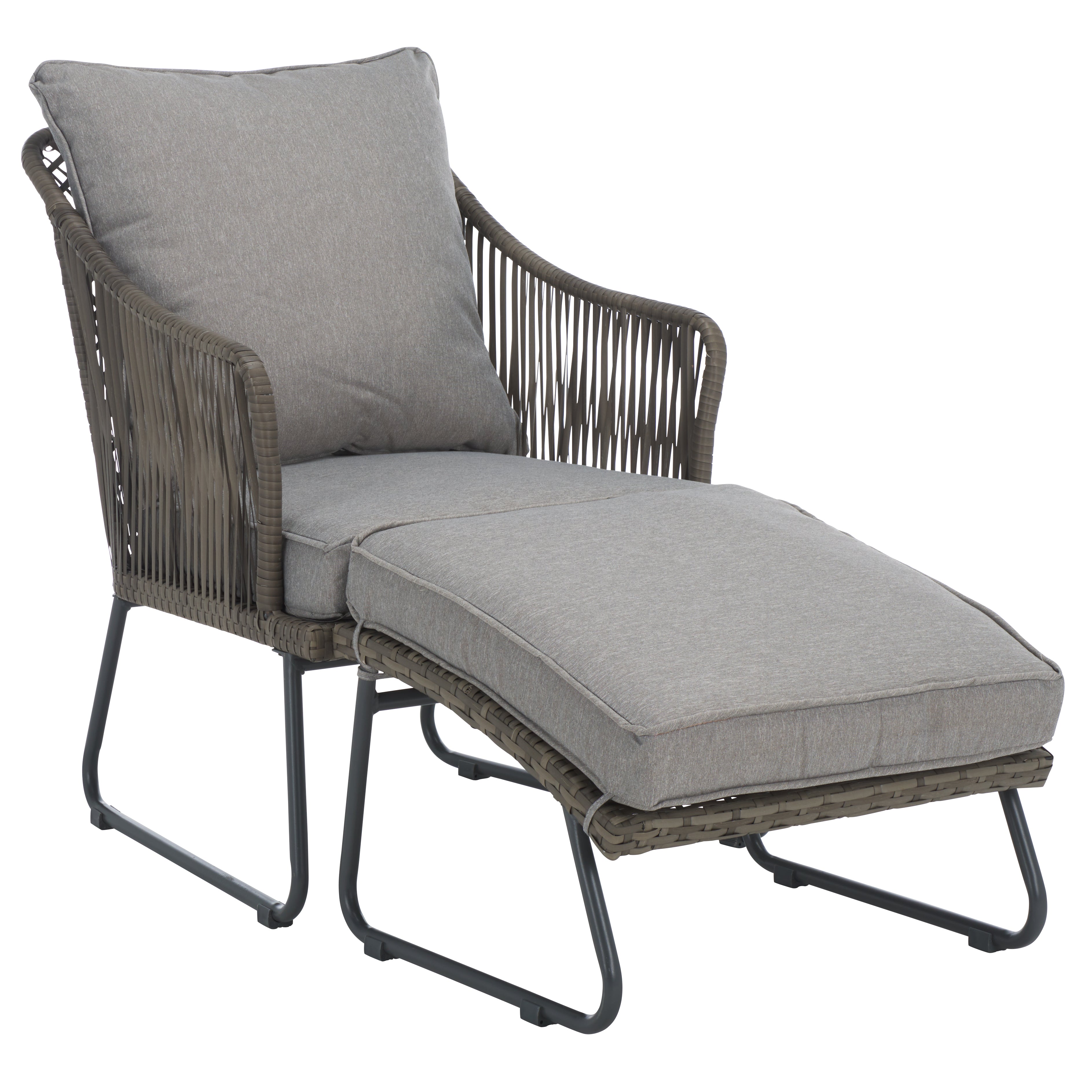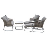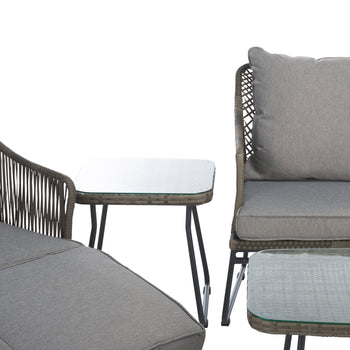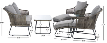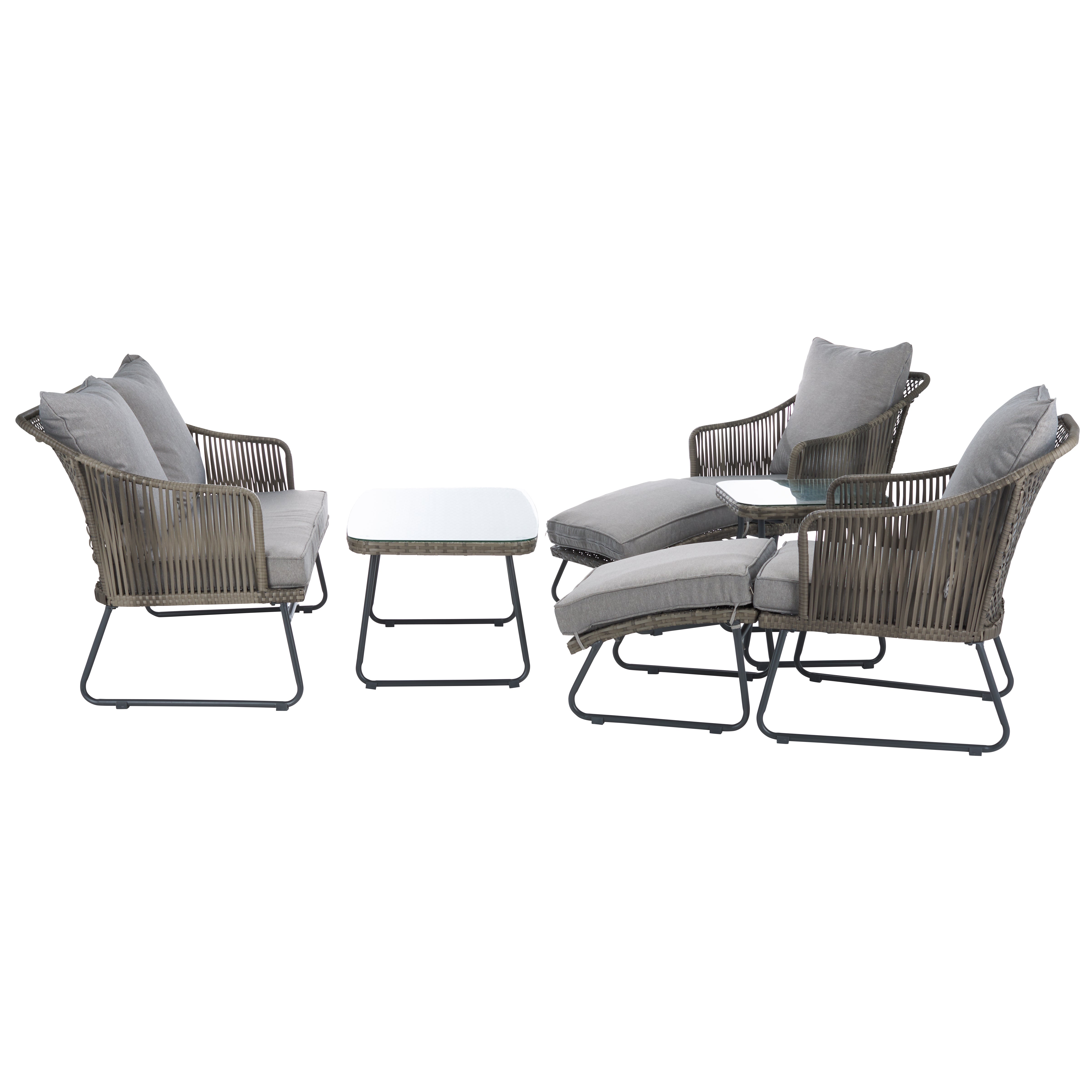 This Lonra 5 Piece Lounger Set revitalizes Mid Century design with coastal cool flair, perfect for contemporary outdoor entertaining. Hairpin legs and grey woven rattan give Lonra's loveseat, two chairs, matching ottomans, petite accent table, and glass topped coffee table a sense of depth, while matching plush grey cushions ensure long hours of comfortable sunbathing.