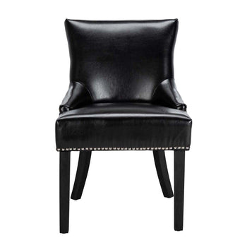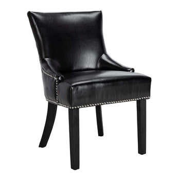 Straight, angular lines and simple details distinguish the padded Lotus KD side chair, in black leather and legs finished in rustic black. With curved rear legs, exposed nail heads and modest sloping arms, Lotus carries a contemporary, slightly masculine edge.