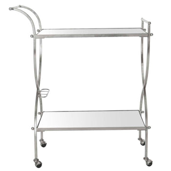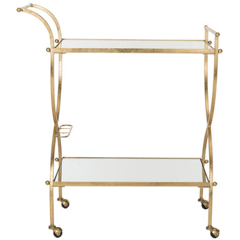 Restaurant chic service can be yours at home with the portable Lucretius Bar Cart. Its graceful handles and elegant frame of beautifully forged iron in a lustrous gold finish are contrasted with mirrored glass shelves for barware, bottles, and more.