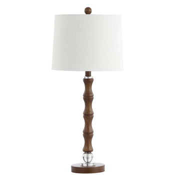 Designed with rich textures and soothing hues, this contemporary table lamp updates any living room. Often used in pairs, its rich dark wood finish is inspired by the beauty of nature, while its complementary textured cotton shade creates a soft glow.