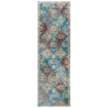 Boasting a transitional style, this rug harmoniously blends the classic with the contemporary, featuring a pattern that showcases decorative medallions and floral motifs imbued with subtle distressing to create an heirloom look. The palette is an enchanting mix of ivory and turquoise set against a diverse color spectrum, providing a captivating visual that will be the centerpiece of any room.