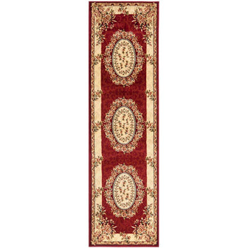 The stunning RED / IVORY color palette of this rug is accentuated by an exquisite pattern, as depicted in the image, featuring a grand central medallion surrounded by a harmonious arrangement of florals and intricate borders. The traditional design elements are rendered with precision, creating an opulent focal point in any hallway or narrow space in need of an elegant touch.