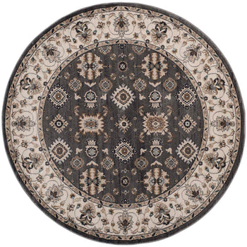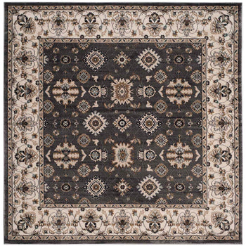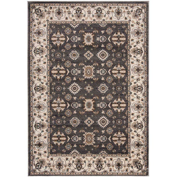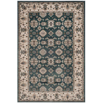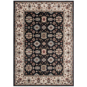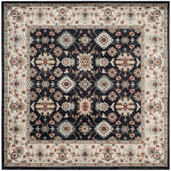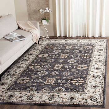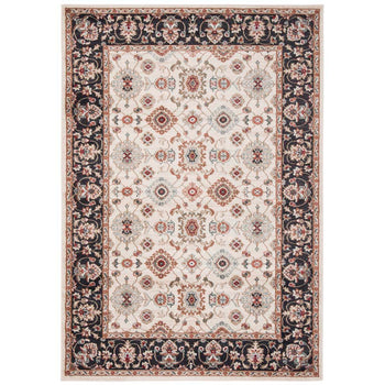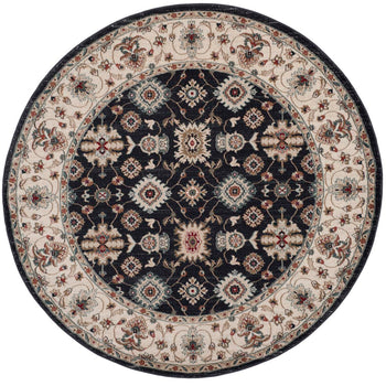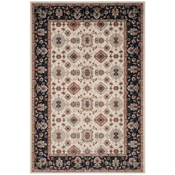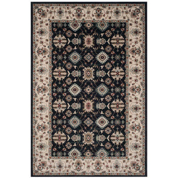 The rug displays an intricate pattern that evokes the classical beauty of traditional designs, with majestic motifs and flourishes that will captivate the eye. Subtle cream serves as the canvas for deep navy patterns, along with touches of warmer hues that add depth and warmth to the overall aesthetic.